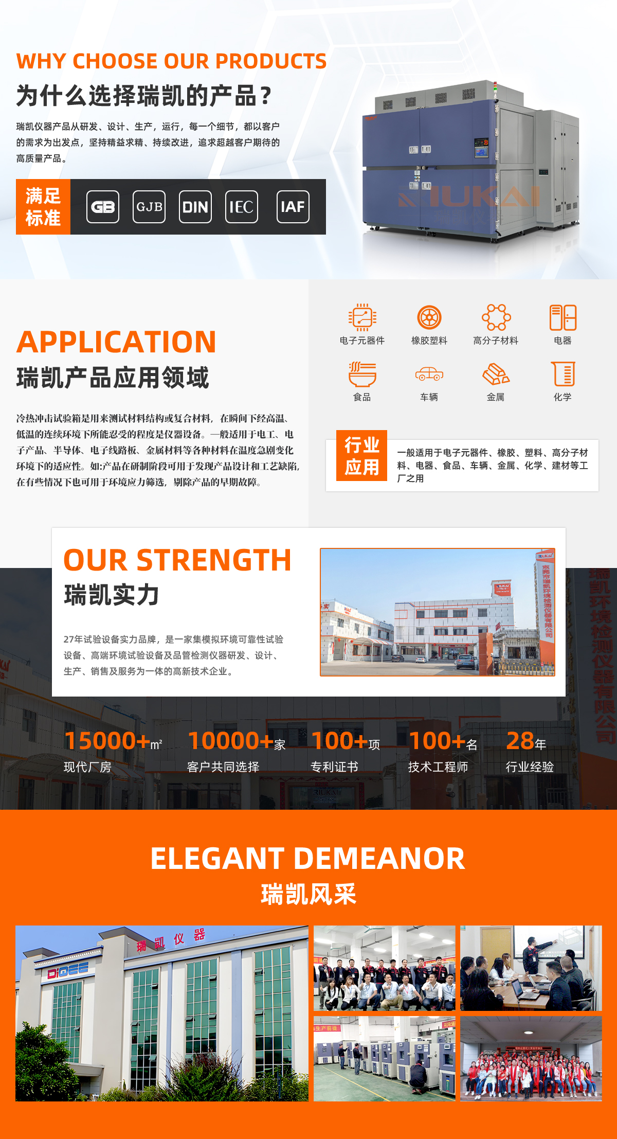 冷热冲击试验箱是用来测试材料结构或复合材料,在瞬间下经高温、低温的连续环境下所能忍受的程度是仪器设备。—般适用于电工、电子产品、半导体、电子线路板、金属材料等各种材料在温度急剧变化环境下的适应性。如:产品在研制阶段可用于发现产品设计和工艺缺陷,在有些情况下也可用于环境应力筛选,剔除产品的早期故障。